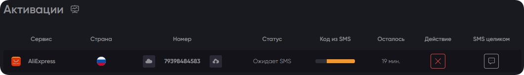 Купленный виртуальный номер телефона для AliExpress и любого другого выбранного веб-сайта остается активным в течение 20 минут. Этого достаточно для того, чтобы пройти процедуру регистрации без спешки, получить новый код, если предыдущий не прошел или вышло время введения кода.