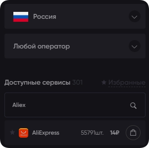 Выберите в колонке слева торговую площадку AliExpress. Обратите внимание на цифры справа от называния веб-ресурса: они говорят о количестве временных номеров для AliExpress, а также их стоимости.