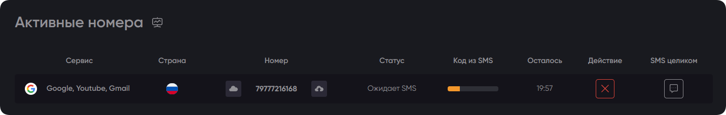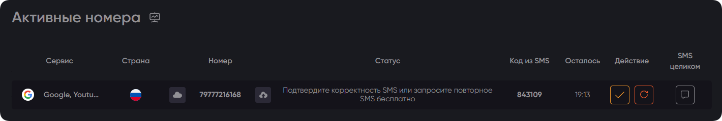 Вставляем купленный виртуальный номер. Возвращаемся на платформу 365SMS и ждем поступления кода для верификации. Это занимает несколько минут. Комбинация появится в одноименном столбце.