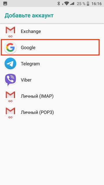 3. Выберите «Добавить аккаунт», а из предложенного списка выберите Google.