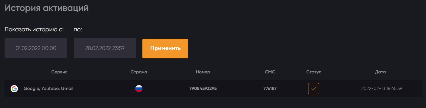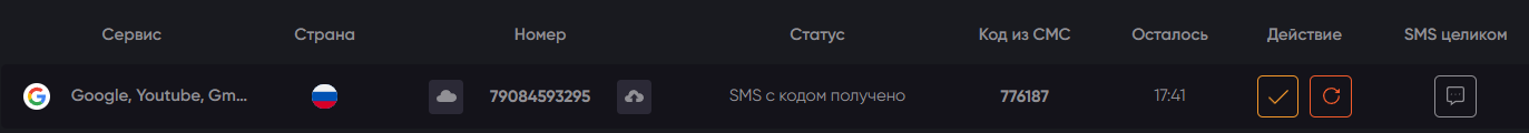 После того, как номер для Google был успешно получен и активирован, нажмите галочку на платформе 365SMS.
