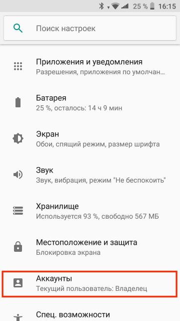 2. Найдите пункт «Аккаунты» и откройте его.