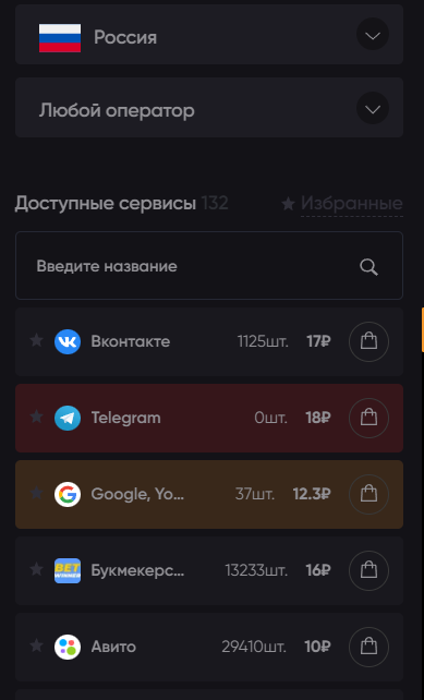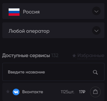 Нас интересует Вконтакте. Справа от названия указано количество доступных номеров и стоимость одной штуки.