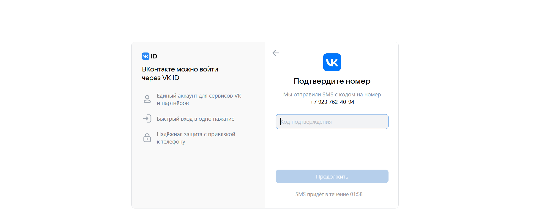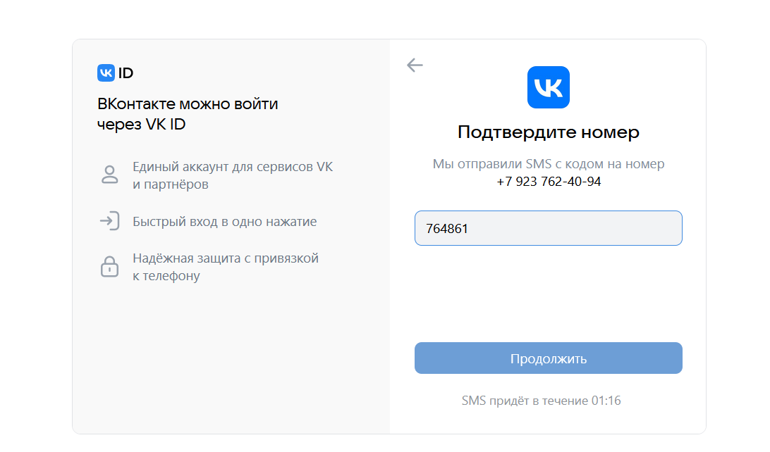 На все действия с контактом дается 20 минут. Поэтому открываем регистрационную форму ВК и вносим туда выданный номер.