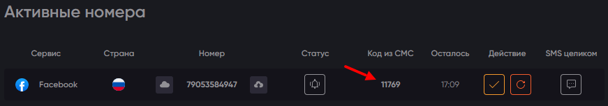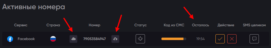 После того как вы нажмете на значок покупки, система подберет для вас активный номер, который можно использовать для регистрации. Чтобы его скопировать с кодом страны или без него, следует нажать на кнопку «Скопировать» (слева от номера – скопировать без кода, справа – с кодом). В колонке «Осталось» указано сколько времени будет активен виртуальный номер.