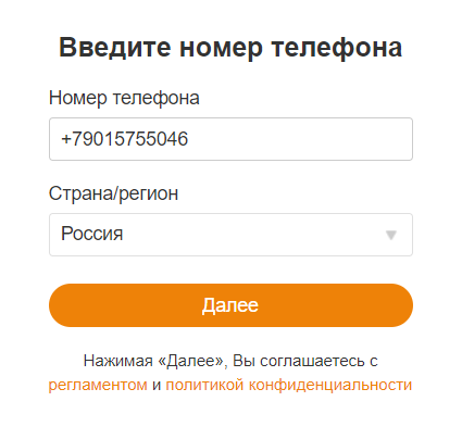 Как только номер будет получен, введите его на странице регистрации в Одноклассниках и укажите страну, совпадающую со страной регистрации номера. Нажмите «Далее».