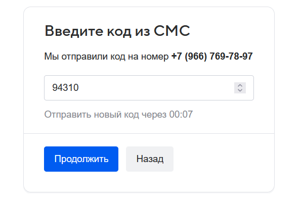Как только код поступит, он отобразится в поле «Код из СМС».