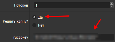 Потоки не трогаем. В пункте "Решать капчу?" ставим "Да" и на сайте rucaptcha берем свой api key и вставляем в интерфейс программы.