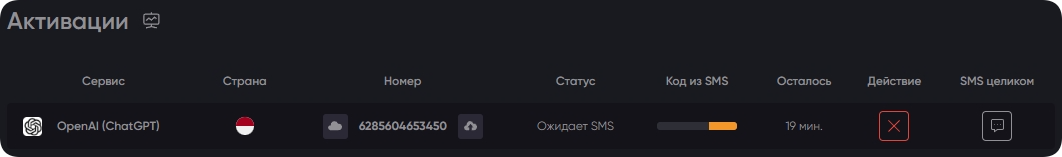 Любые одноразовые номера телефонов, для ChatGPT или любого другого веб-ресурса, активируются на 20 минут. Этого времени достаточно для прохождения регистрации, получения кода подтверждения. Если сообщение по каким-то причинам не прошло, можно запросить код повторно – деньги за это наши клиенты не платят и количество SMS-ок от одного веб-ресурса на один онлайн-телефон не ограничено.