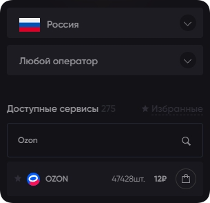 В колонке доступных сервисов найдите OZON с узнаваемым значком. Цифра в шт. справа от названия говорит о количестве свободных онлайн-номеров для него. А следующая – цену в рублях.