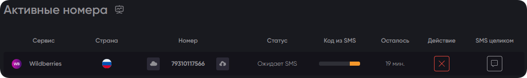 Созданный уникальный виртуальный номер для Wildberries появится в списке активных номеров.