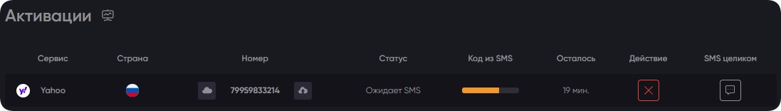 Чтобы принять СМС от Yahoo, перейдите в личный кабинет на нашем сервисе. Код появится в течение 10-30 секунд. Введите его и нажмите кнопку подтверждения. Все, ваша учетная запись зарегистрирована! Вам остается только отправить использованный телефон в архив, нажав на желтую галочку.